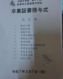 地元長森南中学校の卒業証書授与式に参列させて頂きました 素晴らしい卒業式 素晴らしい卒業生の合唱 中学生最後の日 これからの皆さんのそれぞれの旅立ちに 心からお祝い申し上げます。 ご卒業おめでとう! 卒業生のご家族の皆様 本当におめでとうございます 心よりお祝い申し上げます。 校長先生はじめ先生方お疲れ様でした ありがとうございました。